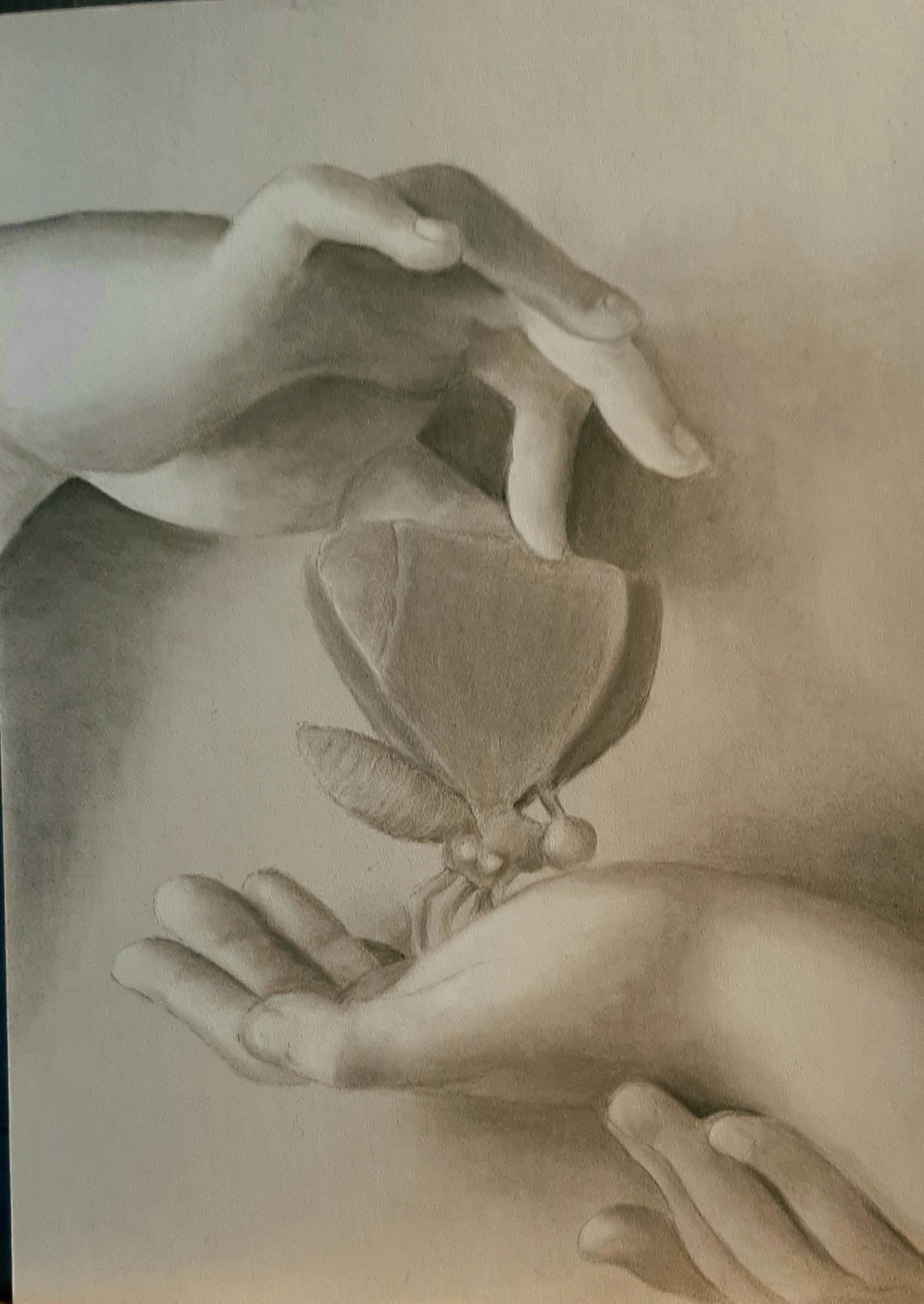 In quest’opera possiamo osservare un dettaglio tratto da una scultura realizzata da Antonio Canova intorno alla fine del Settecento, l’Amore e Psiche stanti. La composizione si svolge attorno ad una farfalla, effimero e misterioso simbolo dell’anima, emblema di Psiche. La giovane amata da Eros, che ha in Aphrodite la terribile suocera, sfiora con delicatezza le ali di una grossa farfalla mentre aiuta l’amato a sostenere la creatura sul suo palmo. Si tratta di gesti di estrema delicatezza ed affetto, di un amore per certi versi platonico, che si compiace della vicinanza in una comunione d’intenti. In questa ripresa artistica le ombre non sono profonde e si predilige una chiarezza morbida, un po’ sfumata, un volume dolce e delicato che solo il pastello è in grado di restituire con questa precisione. Di nuovo il disegno ha studiato gli spazi, ha composto prima per guidare la vista, per far vivere un’esperienza ravvicinata che induce alla contemplazione.
