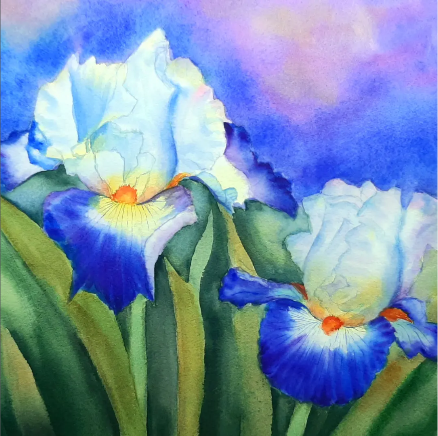 Due iris azzurri e blu si schiudono rigogliosi dopo un pomeriggio, od un’alba, di pioggia e già le nubi si tingono del rosso rosato che preannuncia bel tempo. I petali superiori acquistano in questa circostanza una speciale fosforescenza in grado di esaltare i toni gialli che conferiscono alle corolle luce propria, di un tipo che capta tutti i riflessi circostanti. Le lunghe foglie del cespuglio sottostante riequilibrano una composizione angelica ed ovattata. La capacità disegnativa e la tecnica loose creano atmosfere sognanti che si accostano al reale e permettono al sentimento di fare breccia con vaporosità e dolcezza. C’è in questo caso una forza attrattiva che dall’alto spinge giù con una leggera vertigine verde che converge in basso al centro e l’occhio la segue. Si tratta di una discesa che guida la riflessione dalle cose più aeree e fumose alla concretezza della natura, con i fiori, effimere creature di mezzo, stupendi splendori.