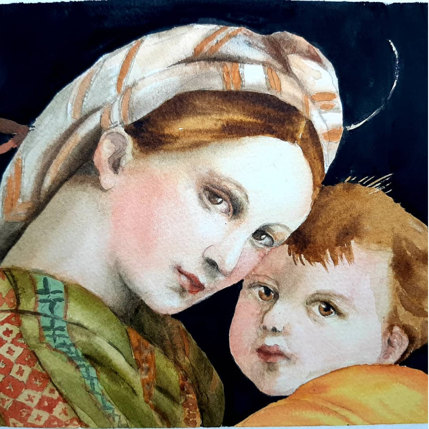 Confrontarsi con le opere realizzate dai grandi pittori della storia dell’arte non è mai semplice, inevitabilmente si tende a non brillare e queste prove a nasconderle. Non è questo il caso, anzi il confronto regge bene con l’originale. La mano è diversa, Raffaello è più dolce, qui invece c’è un po’ più di spigolosità. Gli sguardi sono piuttosto prossimi, il bambino è appena più naturale, la madre pare più adulta. La resa degli abiti, sia nelle trame decorative sia nelle stoffe, è ugualmente felice e vivace. Unica nota la resa dei raggi delle aureole, di cui però si deve tener conto della resa tecnica dell’acquerello. La nostra artista ha utilizzato nuovamente il candore della carta, studiato bene il disegno e scelto il taglio della sua composizione. L’esito è felice, espressivo, e superato questo scoglio non c’è più nulla che debba temere, non se adotta lo stesso rigore qui presente. Anche lo sfondo in Raffaello è lo stesso, c’è in lui però un maggior calore, più diffuso, ed una morbidezza cinquecentesca lumeggiata. Per la nostra acquerellista questa è una prova egregia.